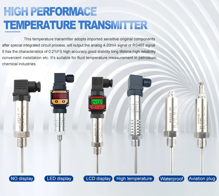 Ce transmetteur de température PT100 adopte le thermocouple ou la résistance comme élément de mesure de la température. Il est normalement assorti à l’affichage, à l’enregistrement et à l’instrument de réglementation pour mesurer la température (de -50 à 250 centigrades) du liquide, vapeur, gaz et solide pendant les divers processus de fabrication.