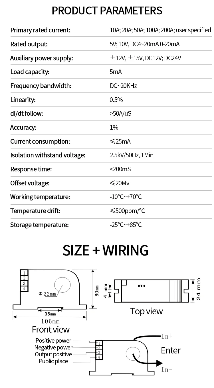 | Transducteur de courant AC/DC, 4, 20mA 0, 10V, RS485, 1A, 150A, trou de 22mm | Le transmetteur de courant peut changer directement le courant alternatif ou le courant continu de la boucle principale testée en DC4 ~ 20mA (DC1 ~ 5V converti par résistance 250Ω ou DC2 ~ 10V converti par 500Ω résistance) signal standard d’anneau de courant constant dans la proportion linéaire, et continuellement transmis au dispositif de réception (Ordinateur ou instrument d’affichage). |