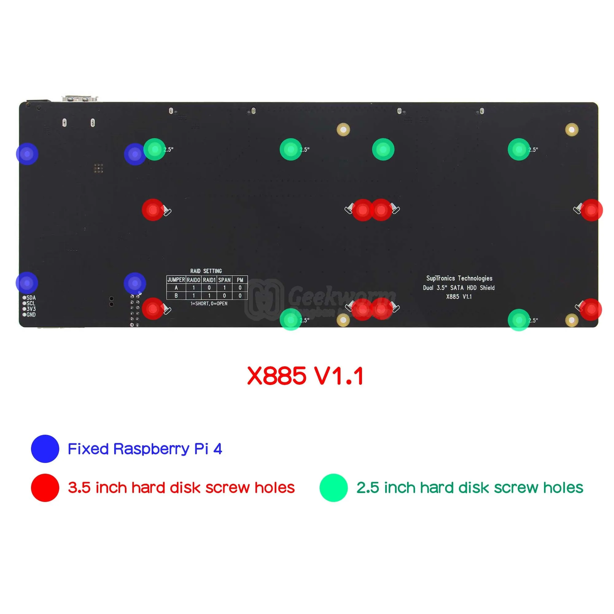 | Solution de stockage idéale pour Raspberry Pi 4 – Dual SATA Gen3 ports Shield | Ce blindage X885 permet d’ajouter facilement une grande capacité de stockage externe haute performance à votre Raspberry Pi 4. |