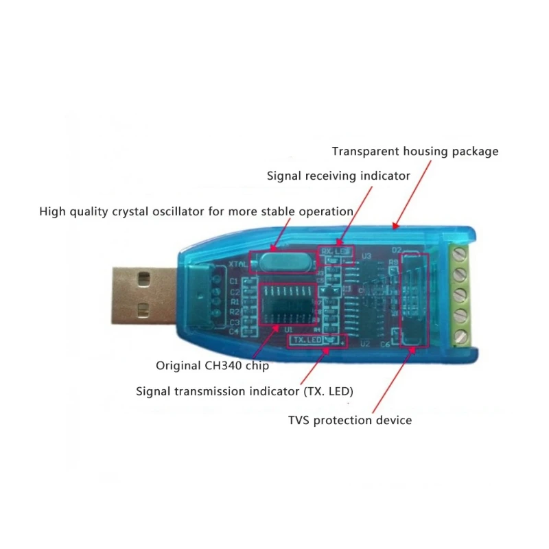 Le convertisseur USB vers RS485 pour Protection est un produit de haute qualité et de niveau industriel. Sa fonction de suppression transitoire de TVS garantit une protection efficace contre les dysfonctionnements internes de la puce dus à des incompatibilités de niveau. De plus, il n’est pas nécessaire de connecter des adaptateurs d’alimentation externes, ce qui le rend pratique à utiliser. Il est adapté pour une utilisation avec des PLCs, des imprimantes, des systèmes de positionnement et des dispositifs de contrôle industriels.