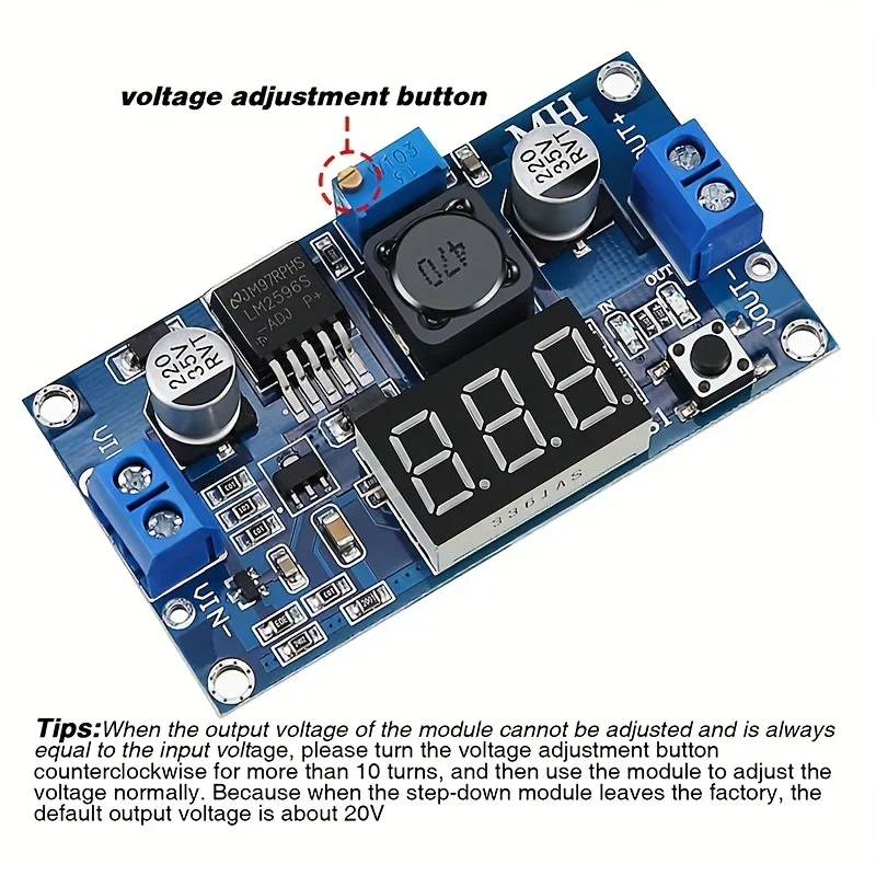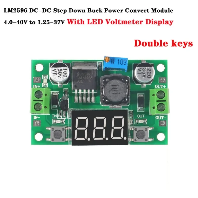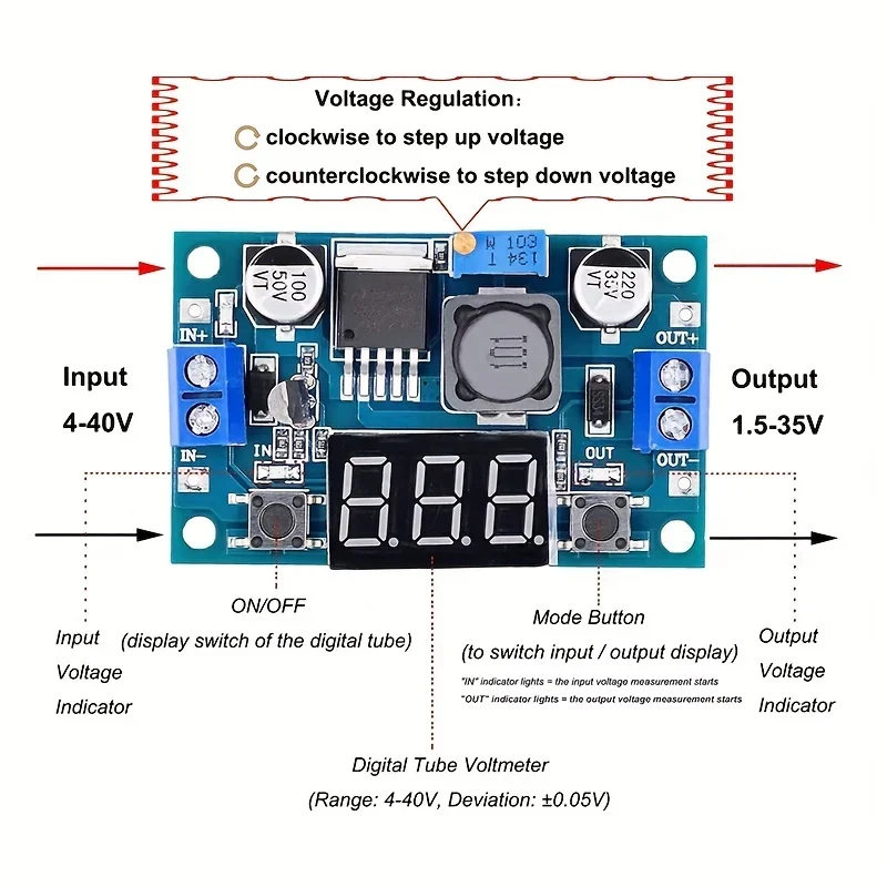 Le Voltmètre à affichage LED Sochi est un convertisseur abaisseur de tension réglable qui offre une plage de tension d’entrée de 4.0 ~ 40V et une plage de tension de sortie réglable de 1.3 ~ 37V. Il dispose d’un afficheur LED pour mesurer la tension d’entrée ou la tension de sortie. Grâce à un microprocesseur de tension avancé, la précision du voltmètre est de ±0.05V. Le voltmètre peut être facilement éteint en appuyant sur un bouton. Il est fourni avec des borniers pour une utilisation sans soudures. Cependant, il est recommandé de ne pas dépasser un courant de sortie de 2A pour éviter une surchauffe. Avec une haute efficacité de conversion de 88%, ce convertisseur offre une performance fiable. Il est également doté d’une protection contre la surchauffe et les courts-circuits pour garantir une utilisation sécurisée.